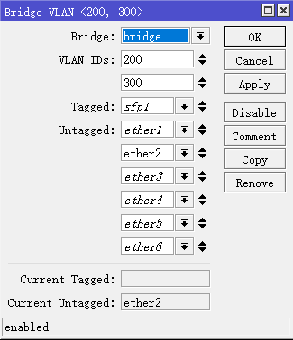 add bridge=bridge1 tagged= sfp1 vlan-ids=200,300”这样的配置是错误的,新版本的RouterOS,在多VLAN trunk的时候,会提示“port with pvid added untagged group which might cause problems,consider adding a seperate vlan entry”