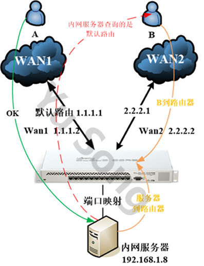 WAN1作为默认路由出口,A用户通过WAN1访问映射的服务器是ok的,但WAN2作为策略路由(通常路由器只会配置一条默认路由,除非ECMP场景)线路是失败的,按照PCC提到的input和output返程路由策略路由器本地双线访问是ok的,为什么在端口映射会失败。这里我们要把到WAN2的路径分为两段,如下图