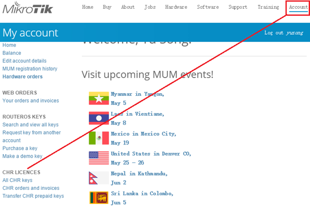 下一步是购买P1或者更高版本许可,首先进入MikroTik.com account server ,登录成功后,选择CHR LICENSE下的 'All CHR keys'