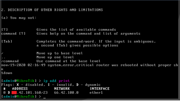 我安装完后没有及时修改密码就被黑了,黑的方式是,添加RouterOS计划任务,定时通过fetch下载脚本,import导入脚本,脚本会开启ip socket服务,允许指定IP连接到RouterOS的socket接口,然后关闭掉ip service下的所有服务端口,使得远程无法管理RouterOS,还好没有修改admin密码。