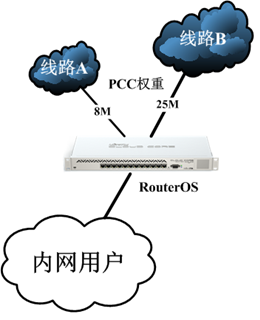 实现原理比较简单,一条8M,一条是25M,后者大约是前者的3倍出口,所以约等于1:3,那就是要按照1:3的比例分配路由,策略将PCC策略看成4份,然后指定按照1:3的路由策略规则分配。
