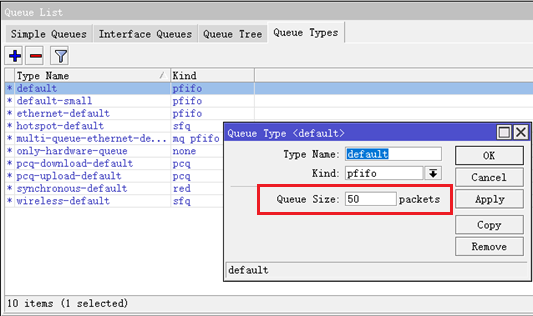 在RouterOS队列容器值(queue-size)可以通过/queue type指定,每种类型的queue type有不同的队列长度大小,队列的类型包括:(pfifo-limit, bfifo-limit, pcq-limit, pcq-total-limit, red-limit,但所有的类型原则上是一样的,即queue-size决定数据报是被丢弃还是延迟发送。
