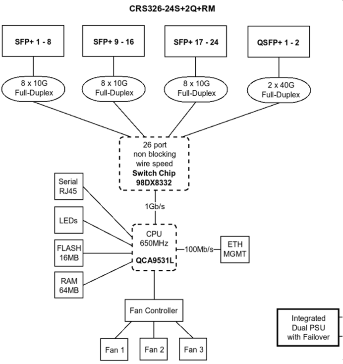 CRS326-24S+2Q+RM是24个10G+2个40G端口产品,在RouterOS v7版本可以支持二层和三层线速转发,从上图框架图可以看到,该型交换机的CPU为QCA9531L连接Switch Chip 98DX8332的交换芯片,但他们之间总线只有1Gb/s,如果数据要交给CPU处理,只能跑1Gb/s,且采用的CPU是当前MikroTik在售路由器中性能垫底的一款,显然不合理。