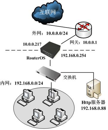 通过下面一个简单的网络拓扑作为配置实例,根据该网络需要通过RouterOS完成配置: