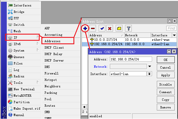 在/ip address中添加IP地址和选择网卡接口,添加内网和外围的IP地址如图: