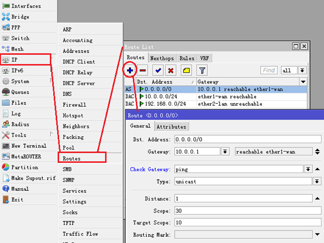 在/ip routes里添加默认网关10.0.0.1,开启check-gateway=ping(网关ping监测)如图: