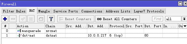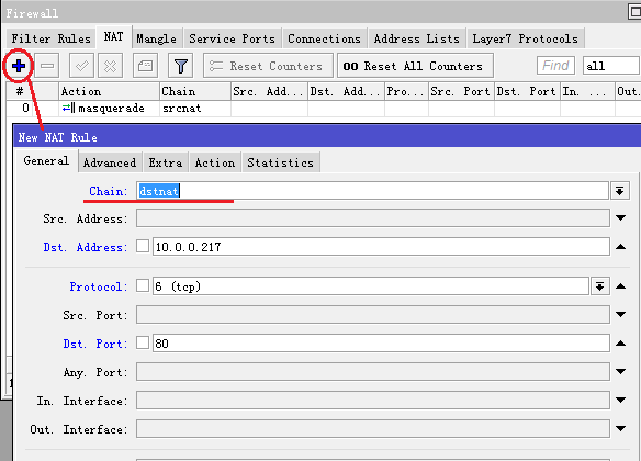 根据以上网络拓扑,需要将内网的http服务器发布到外网,内网的http服务器IP地址192.168.0.88,这里需要做端口映射规则,进入ip firewall nat里,选择chain=dstnat,我们的外网IP地址是10.0.0.217配置到dst-address,dst-port为tcp协议80端口,如下图
