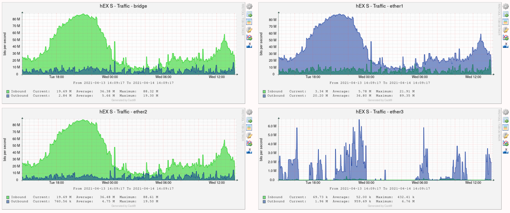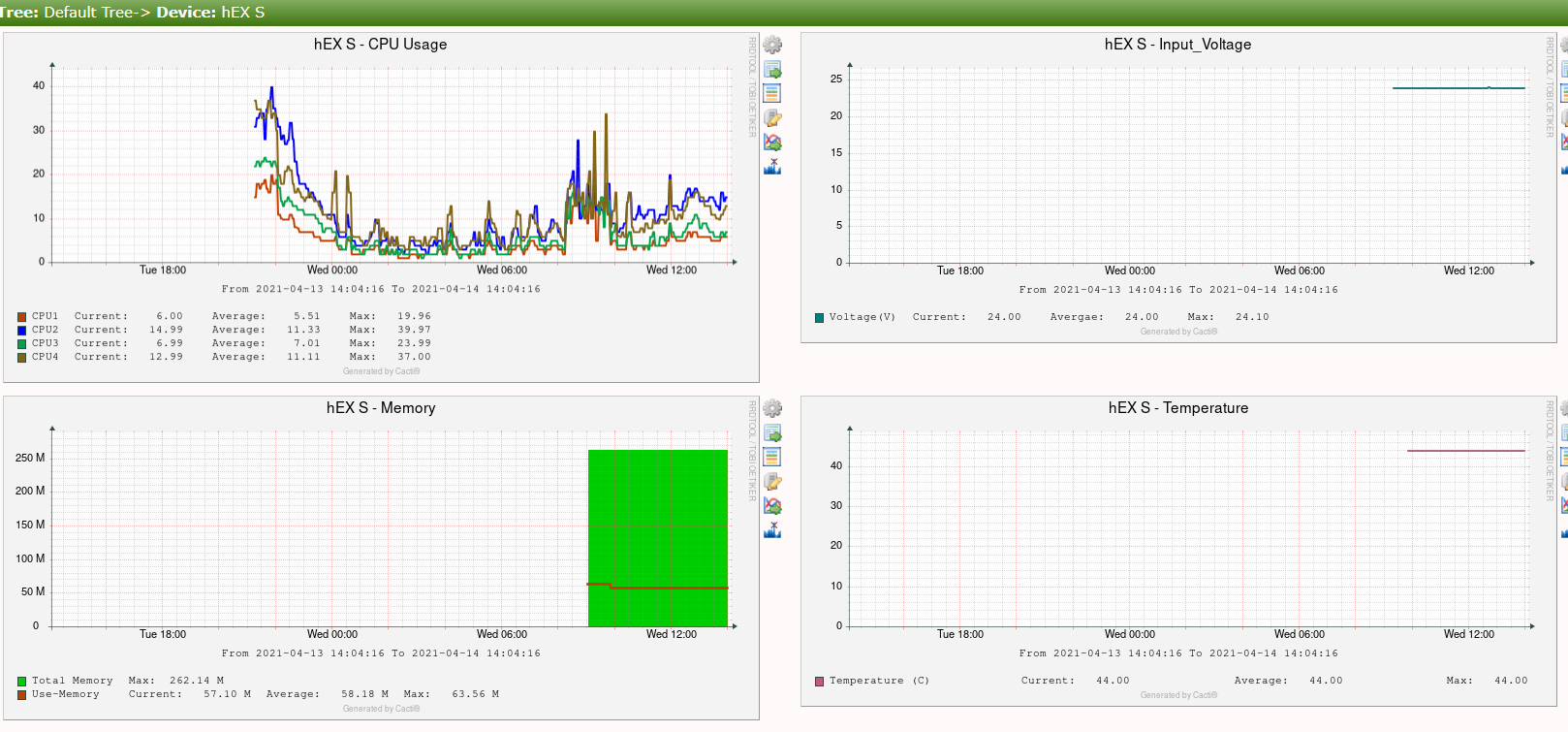 下图是通过Cacti,通过snmp采集MikroTik hEX S的数据,包括CPU(4核分别采集)、电压,内存和温度,以及网卡流量