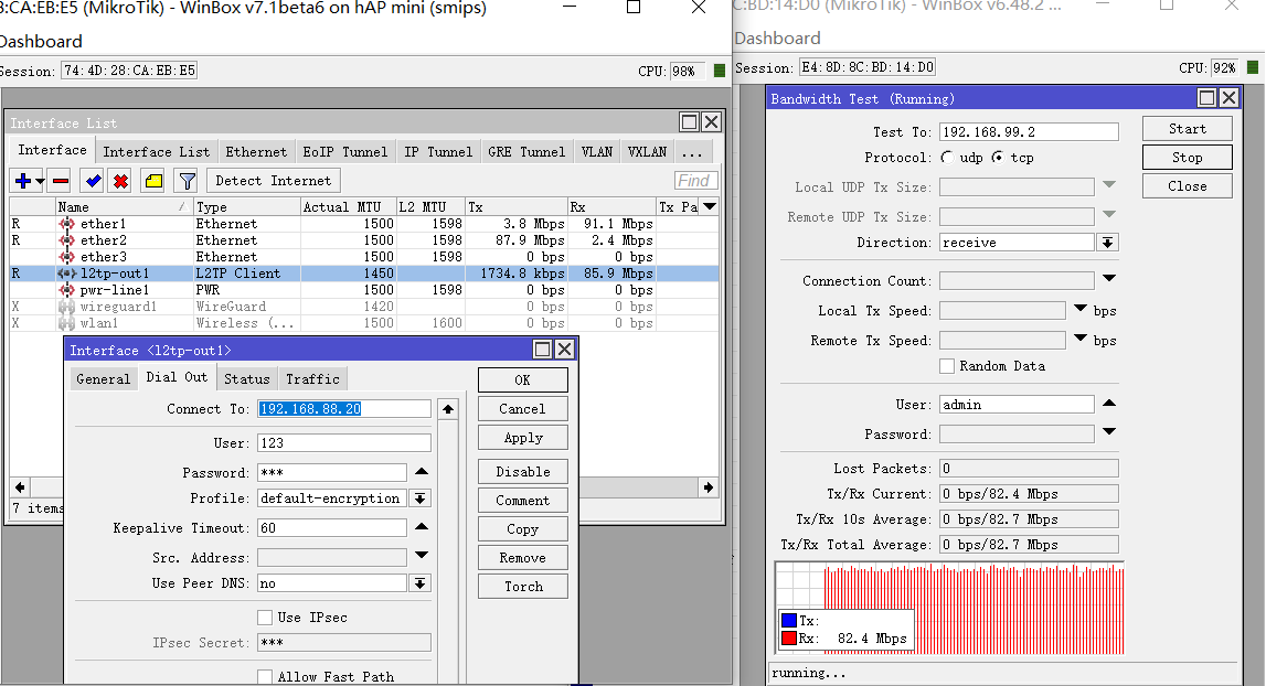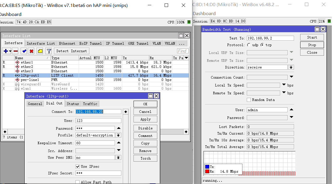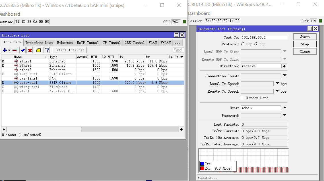 - 用户端RB951Ui-2HnD,作为模拟终端设备进行bandwidth-test带宽测试发起端(RouterOS v6.48.2)