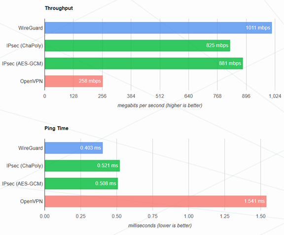 从这个测试数据看使用的是1Gbit的网卡,跑出1011mbps的结果,说明带宽测试采用的是UDP协议,而非TCP。从官方测试性能看,WireGurad对于IPsec优势非常明显,而对于OpenVPN几乎是碾压。