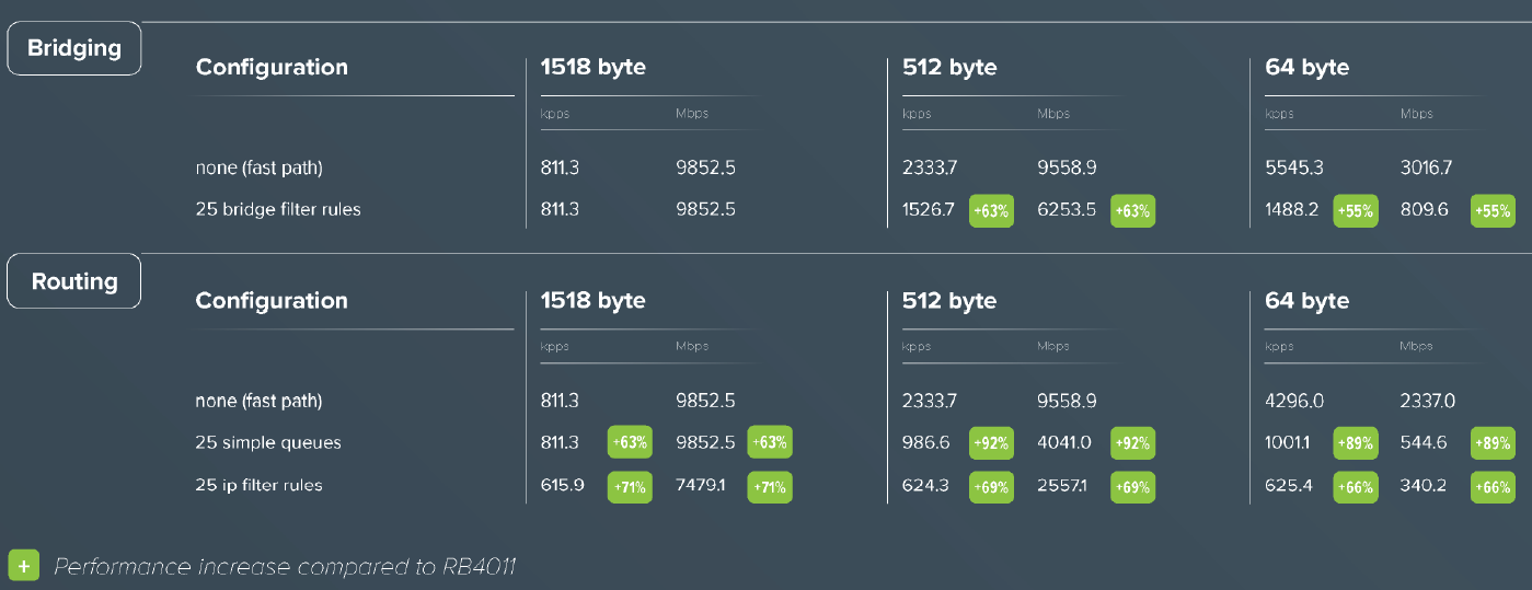 官方给出了性能测试,在默认无规则的转发性能上,和同为4核心A15处理的RB4011差别不大,但凭借A72处理器的单核性能提升,在处理各种规则时,就比RB4011的A15强不少!