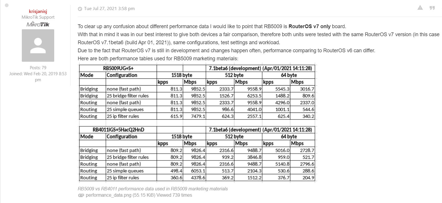 官方已经说明RB5009只支持v7,下面是与RB4011使用v7.1beta6的对比测试,相关性能对比参考: