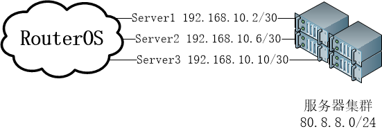 考虑另外一个场景,方向是去一个集群服务器,也就是和之前的案例反过来,RouterOS需要面向客户,让集群服务器需要确保流量调度均衡,也需要按比例分配一定流量,同样是4:4:2,需要标记5条路由规则,下图是服务器集群是三台和RouterOS都有一个/30子网互联:
