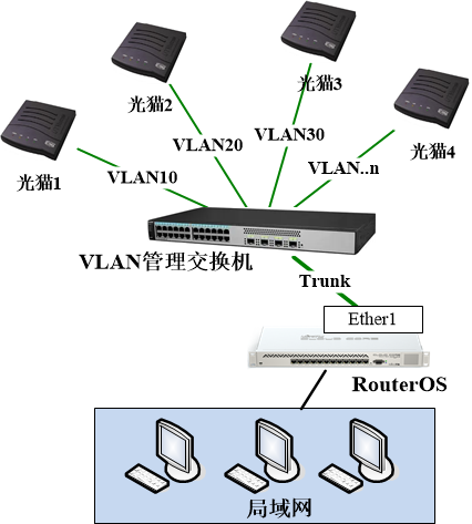 早期民间高手想到了通过二层管理交换机实现了划分VLAN的方式来进行拨号,通过24口、48口管理交换机划分多个vlan id,Trunk给RouterOS一个网卡,RouterOS在interface vlan下建立对应的VLAN id,但每个VLAN接口的MAC地址是从属于实际物理网卡的,VLAN接口的MAC还是相同,所以还要将每个VLAN加入到一个独立的bridge方式,利用bridge可以设定admin-mac的特点,将每组拨号的MAC区分开,达到多线拨号能在一张网卡上实现。如下图: