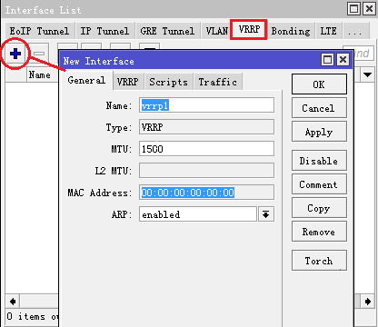在添加项中,进入VRRP项设置interface和VRID,这里interface是设置对应拨号的物理网卡,VRID用于区分多个VRRP虚拟接口的身份,即每个用于拨号的VRRP虚拟接口VRID都不同,其他参数默认,这样vrrp1接口就在ether1-wan上生成了一个虚拟机口(如果你想仔细了解VRRP,可以参考RouterOS入门到精通的VRRP章节)。