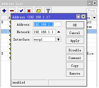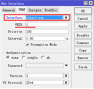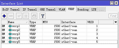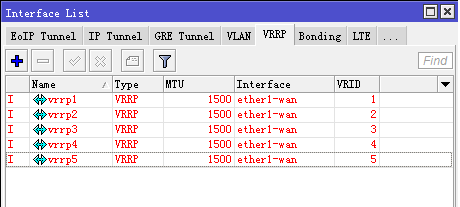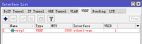添加完成后,vrrp1状态是红色,因为vrrp1接口和ether1-wan没有设置IP地址,之后我们会说明