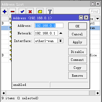首先我们设置ether1-wan接口的ip,192.168.0.1,这里我直接使用主机IP是可以生效的