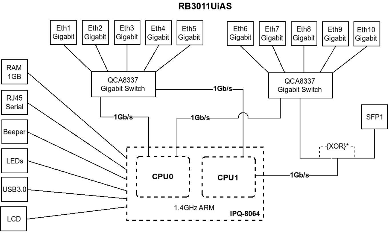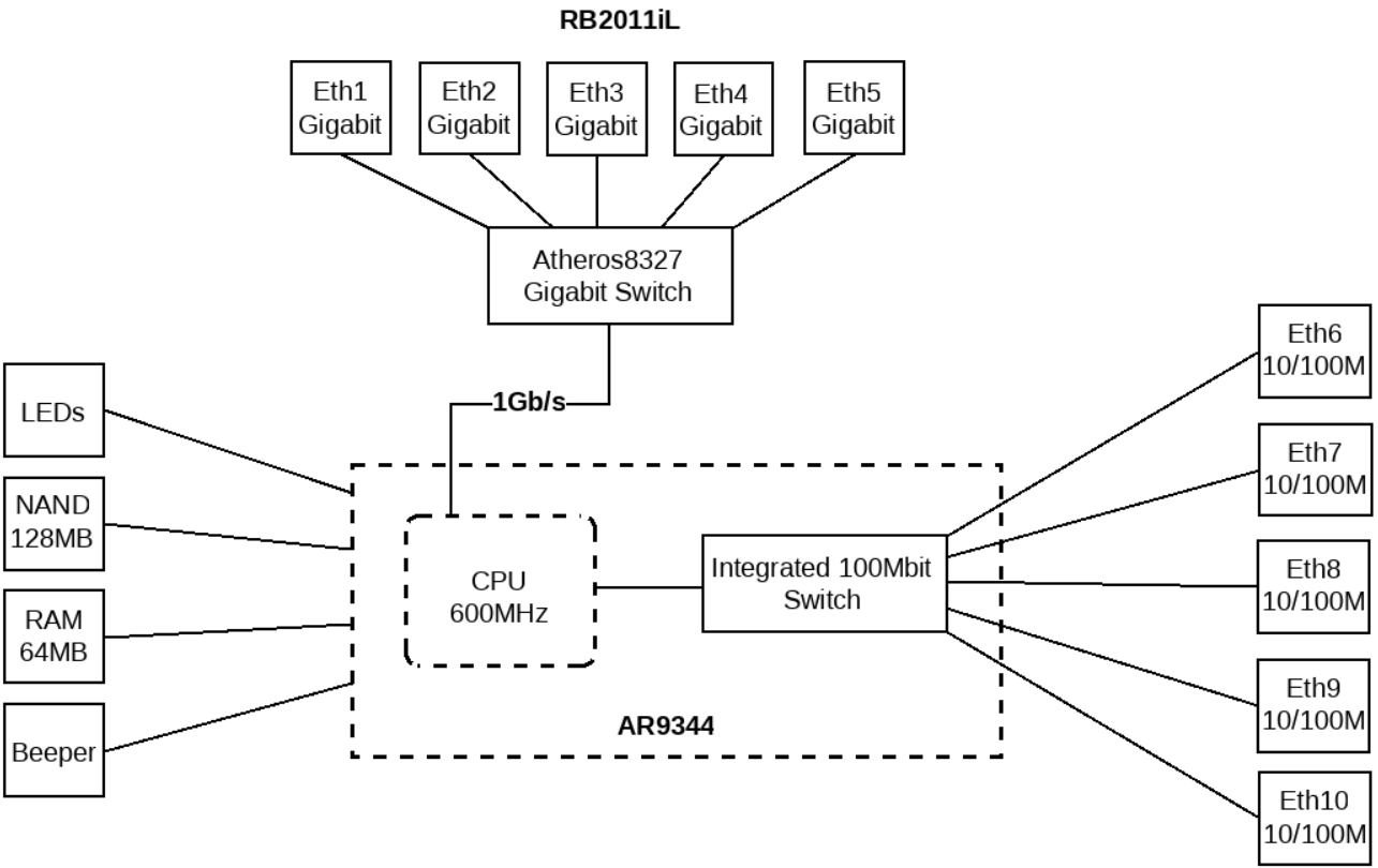 官方的help文档,针对关于RB2011和3011产品,采用两颗交换芯片在网络规划中,可能会要求将所有以太网接口建立在一个Bridge,并配置VLAN策略(通过/interface ethernet switch下配置),以便实现二层流量的线速转发,但跨两颗交换芯片之间的数据是存在问题的,需要经过CPU转发,不能实现线速转发,特别提示下,RB2011和3011在Brdige下配置VLAN是不支持hardware-offloading的,但在switch下配置是可以实现硬件转发的,只是不叫hardware-offloading,只有在bridge下配置vlan才被官方称为hardware-offloading。 提示:RB4011和RB1100AHx4,以及最新出的CCR2004-16G-2S+都是两颗交换芯片,在v7.1rc1版本后,支持hardware-offloading(switch vlan目录被删除),并明确答复在跨交换芯片的以太网接口,需要经过CPU中转。在bridge vlan配置目录下,必须将跨交换芯片的vlan id,tagged给CPU(bridge)。 下面看看两个交换芯片产品的设计框架图 RB2011两个交换芯片,一个是atheros8327,另外一个是AR9344 CPU集成的: RB3011使用了两个QCA8337交换芯片:   我们通过一个例子来说明,假如是RB3011,需要将ether1-ether10创建一个Bridge,有一个端口作为trunk端口,其他端口都是access端口,例如ether10作为trunk端口,ether1-ether9是access端口。