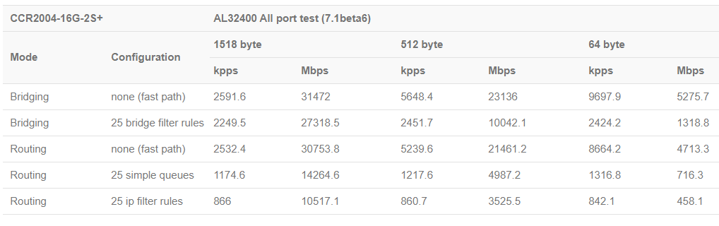一共分了3组数据1518Byte、512Byte和64Byte,每组数据又分为Mbps和Kpps,Mbps大家比较好理解是每秒多少Mbit,Kpps(packet per second)则是,每秒处理多少K的数据包。官方测试包含了bridge桥接转发和Routing路由转发两种,bridge转发下增加了配置25条桥接过滤规则转发,routing路由转发也增加了25条流控规则和25条防火墙过滤规则的转发性能,这样的转发数据更接近用户实际使用的环境。