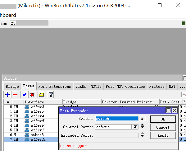 根据Marvell 88E6393的官方资料是支持IEEE 802.1BR,即Port Extender (PE) 扩展终端,但在和CRS326-24S+2Q(作为CB)测试时发现无法支持,提示no hw support,并和官方确认CCR2004-16G-2S+无法支持Port Extender (PE) ,同理RB5009也无法支持Port Extender (PE) :