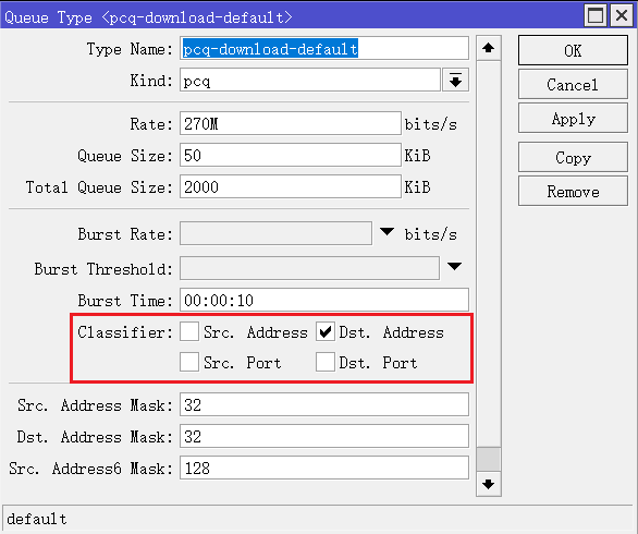 (Max-limit就是Total FIFO全局队列带宽,PCQ-rate就是sub-stream的FIFO子队列带宽)