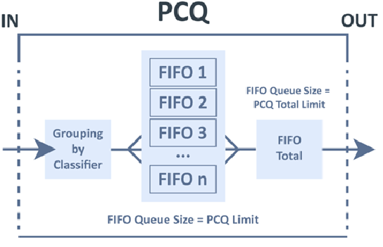 pcq-classifier(分类器)从相应数据流中区分一个sub-stream(子数据流),然后在每一个sub-stream上建立独立的FIFO队列长度和限制,再归类所有的sub-stream在一起,通过全局的Total FIFO队列作总体的流控。
