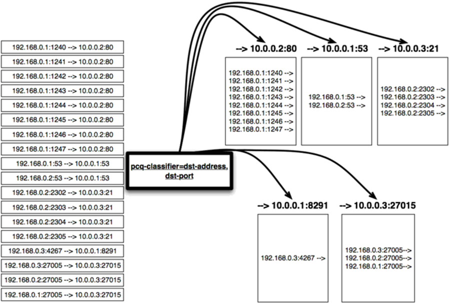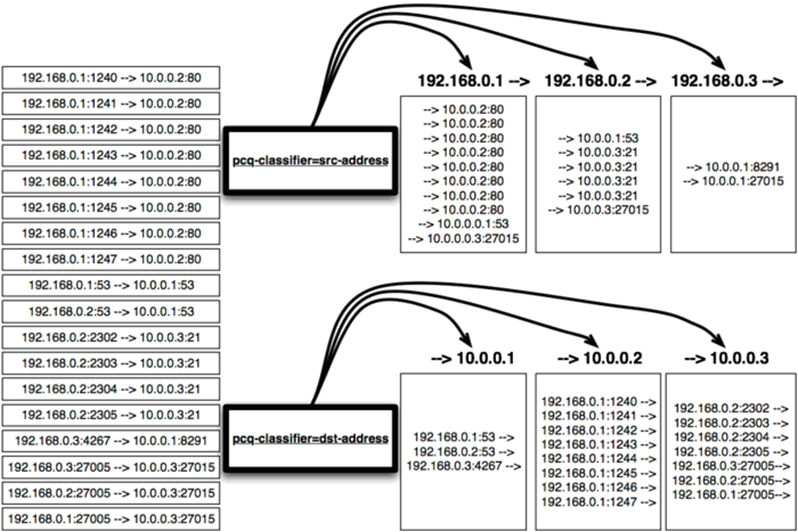 为更好的理解PCQ工作,需要了解分类器,用一组IP地址和端口到对应的地址和端口数据流的实例,这时将选择一种分类器,并通过PCQ将18个数据流从中分离到PCQ的子数据流中进行分类。