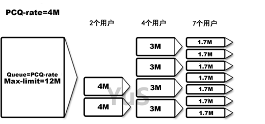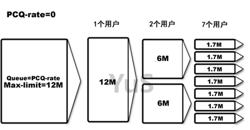 如上图,最大带宽Max-limit=12M,PCQ-rate设定为0,这样在一个用户的时候就可以得到全部带宽,之后是2个用户平均分配,依次类推。