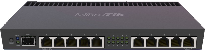RB4011iGS+RM,官方售价199USD,ARMv7 1.4GHz 4核心处理器,1G内存,512M存储,1个10G SPF+光口,10个1G电口(1-5口交换芯片1,6-10口交换芯片2),ether1支持POE输入,ether10支持POE输出