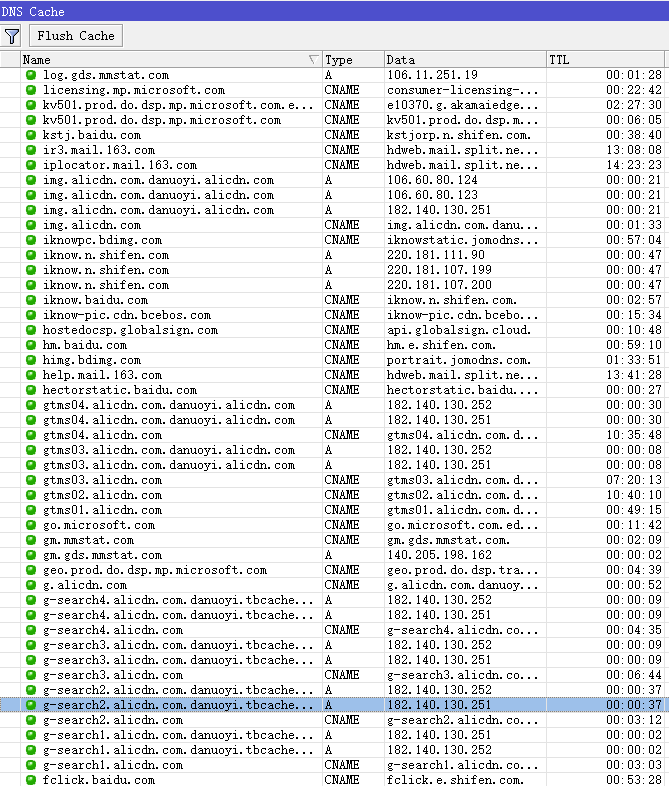 还有g-search1.alicdn.com 、g-search3.alicdn.com和gw.alicdn.com,同样在cmd命令下操作解析,分别转发到了gw.alicdn.com.danuoyi.tbcache.com和g-search1/2/3.alicdn.com.danuoyi.tbcache.com。由于域名过多,如果通过/ip firewall address-list一个个添加非常繁琐。可以选择DNS cache使用正则表达式去抓取这些域名的IP
