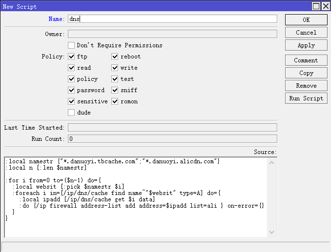 在/system scripts编写以下脚本,这里还包含了另外一个域名danuoyi.alicdn.com(此脚本运行在RouterOS v7)