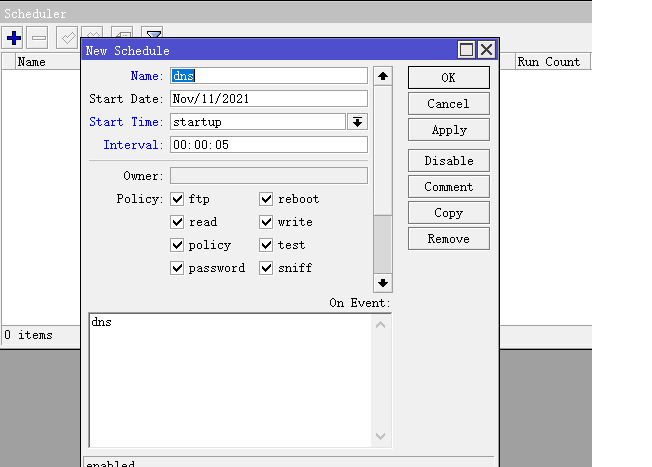 然后在/system scheduler计划任务中加入在script中创建的脚本名称,interval是间隔5秒执行,也就是每5秒抓取一次dns cache列表的域名