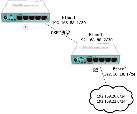 R2路由器也做相同的配置,当然networks和interface两个参数在RouterOS也可以同时设置。