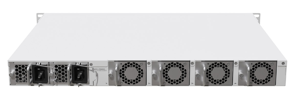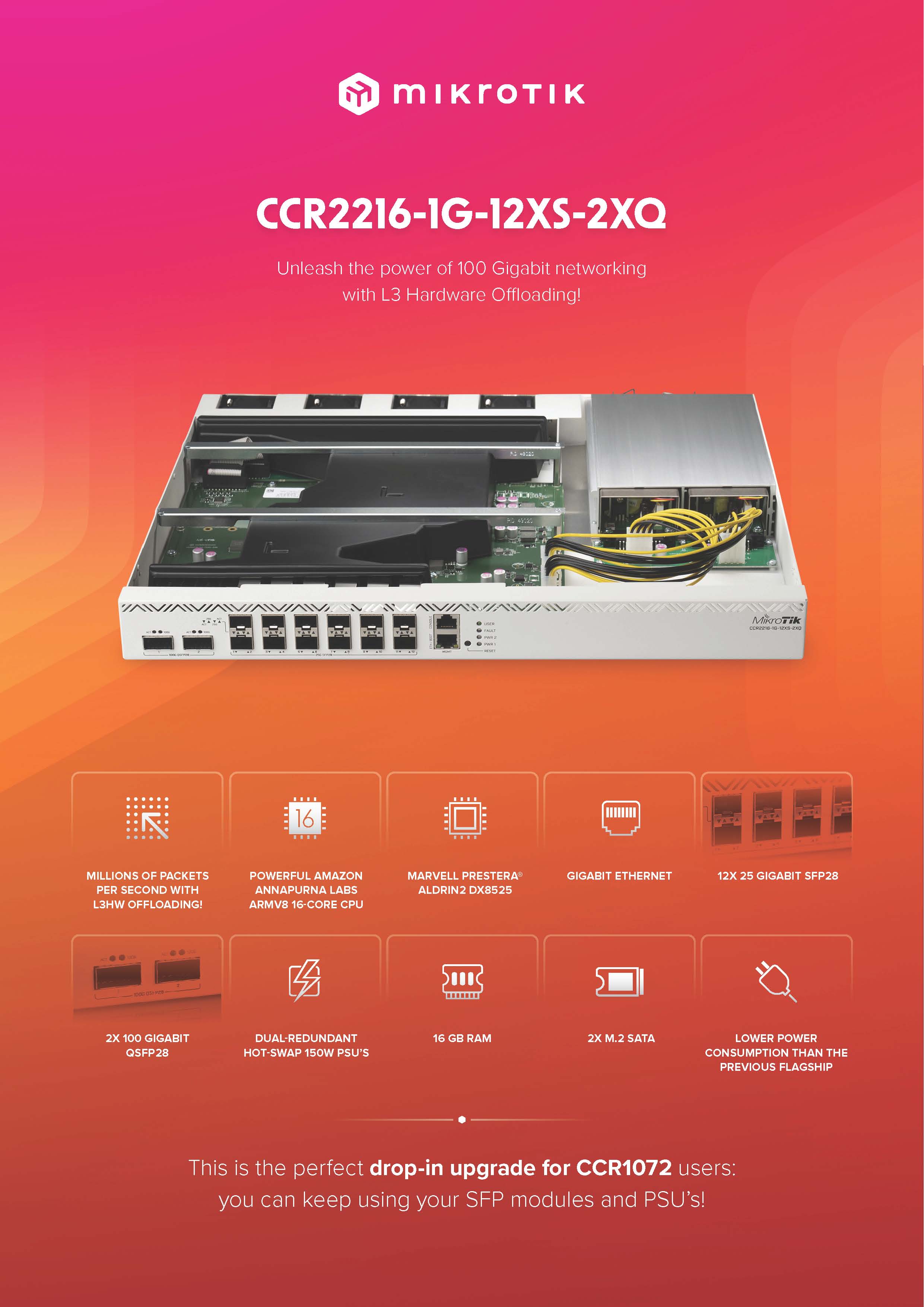 接口配置采用2个100G QSFP28光口,12个25G SFP28光口,和一个1G以太网电口。该设备配备了16GB内存,自带128M NAND存储,另外可以扩展两个M.2存储接口。支持4个热插拔风扇,支持热拔插冗余电源,并且此电源模块和CCR1072兼容