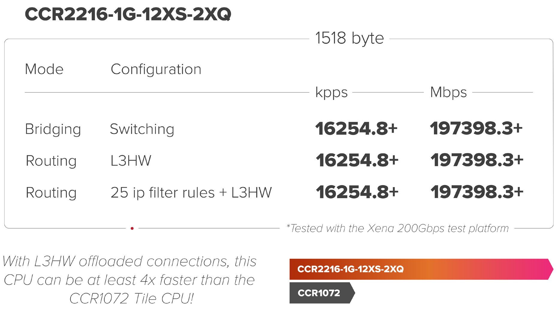 从官方PDF资料给出了一个1518Byte粗略的性能,CCR2216-1G-12XS-2XQ开启L3HW后,性能几乎是碾压CCR1072