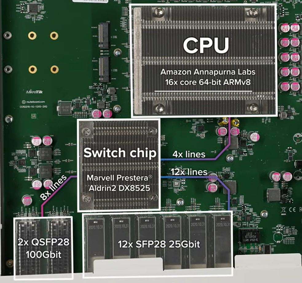 官方资料介绍:CCR2216-1G-12XS-2XQ是新的旗舰产品,Alpine AL73400 16核CPU可以与CCR1072的72核Tile CPU相媲美。最重要的是搭载了Marvell Prestera Aldrin2(98DX8525)交换芯片,支持L3-Hardware Offloading,之前的CCR2116的交换芯片到CPU采用4条10G总线,但这次采用了4条25G总线连接CPU(意味着交换芯片到CPU高达100G总线,AL73400 16核CPU估计无福消受100G流量)!