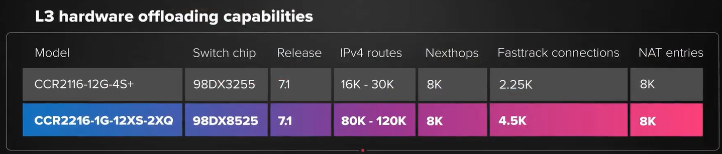 官方宣传视频也介绍了,采用RouterOS v7后,Hardware offloading的功能支持更多了,除了二层交换和三层路由的硬件转发,还支持IPv6路由转发、NAT(ipv4和IPv6)、QoS、MPLS、VRF、VRRP等,估计后续还有更多功能下发到交换芯片处理。在RouterOS跑IPv6说CPU利用率高的朋友,这个坑也算是在CCR2216给填上了,不知道其他的CRS3系列交换机会不会加速IPv6。
