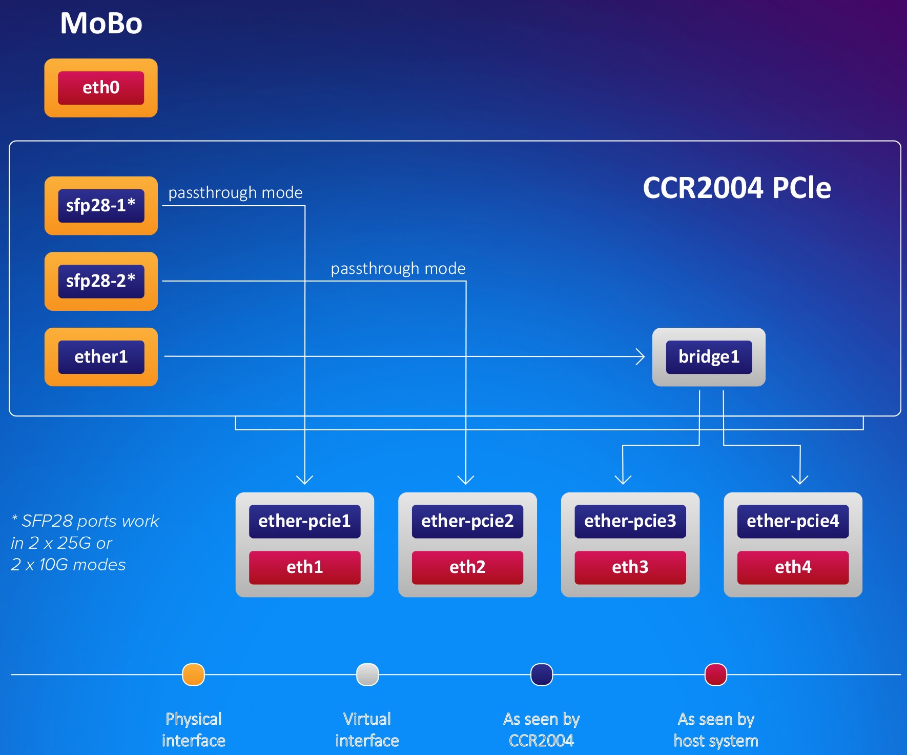 默认情况下,PCIe网卡将显示为四个虚拟以太网接口:25G SFP28作为两个直通模式接口显示,另外两个虚拟的以太网PCIe接口和一个千兆以太网桥接,用于管理访问。用户可以自由配置所有的接口和设置,因为内置了完整的RouterOS功能。