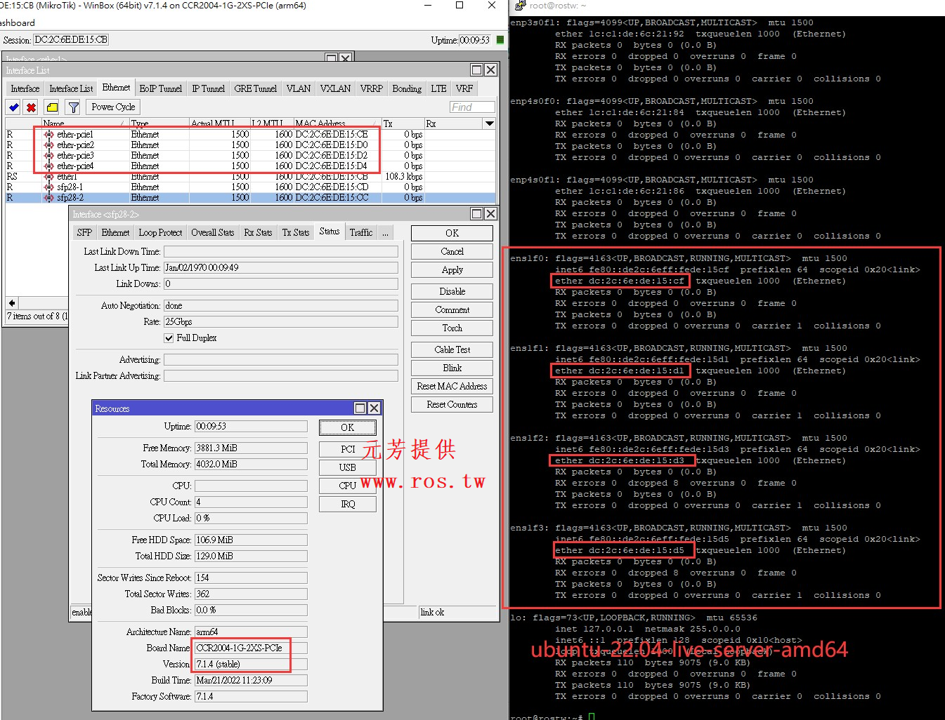 2022年5月1日,元芳提供了一些测试信息: CCR2004-1G-2XS-PCIe安装到主板上的PCIe,通过PCIe为其供电启动,网线连接电口,通过winbox扫描可以找到RouterOS系统。 元芳告诉我在普通PC上安装CCR2004-1G-2XS-PCIe,winbox能找到RouterOS,但无法识别sfp28的25G网卡。安装到HP DL360G7服务器,能识别到sfp28的25G网卡,说明普通PC的BIOS和服务器BIOS上,RouterOS驱动还有问题,肯定是首先优化服务器的兼容。 HP DL360G7上安装ubuntu server 22.04 ,在ubuntu启动后,查看网卡信息,能自动识别到CCR2004-1G-2XS-PCIe的网卡