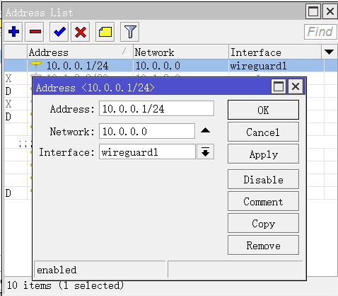 进入/ip address,添加wireguard1接口IP地址10.0.0.1/24,winbox配置如下: