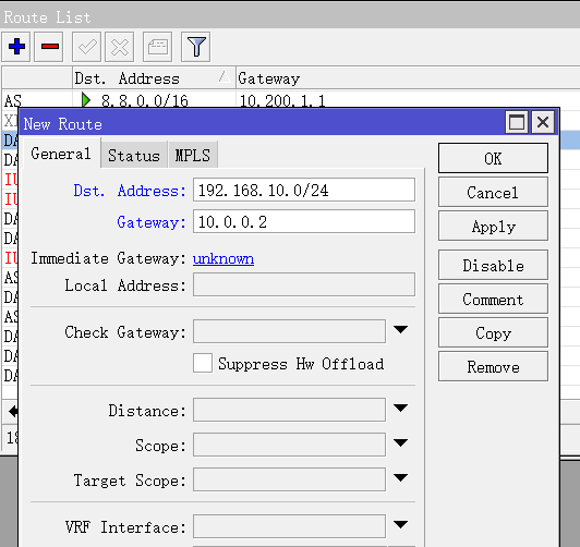 在/ip route下添加到目标IP地址段192.168.50.0/24的静态路由,winbox配置如下: