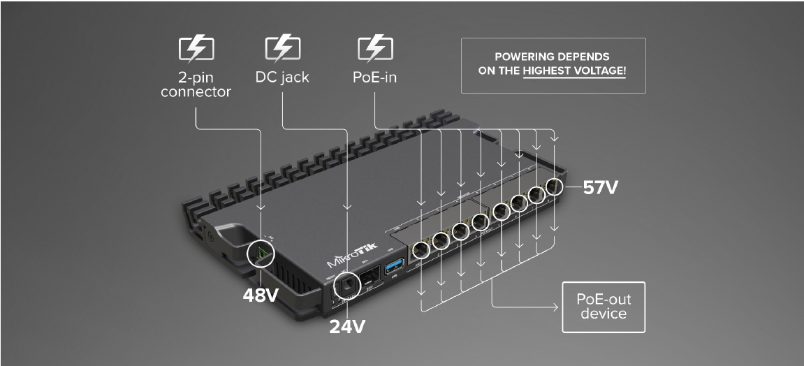 如果某个电源出了问题会发生什么?例如:你有24V的直流插孔,48V的2针供电器,和57V的PoE-in供电,设备会优先选择最高电压输入供电 -- PoE-in。如果Poe-in出现故障,RB5009UPr+S+IN将回落到第二高的电压- 2-pin供电端子,如果继续故障将使用直流插孔上有24V。