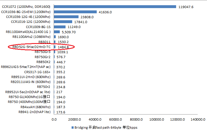 从bridging的64byte吞吐量看,性能好于RB750Gr3,接近于RB3011,高出hAP ac整整4倍性能,看来ARM还是比MIPS强: