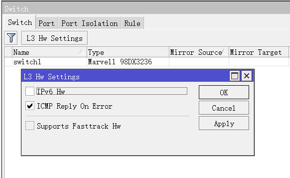 在RouterOS v7.6对L3/Fasttrack-HW-Offloading又一次做了调整,有一个单独的L3 Hw Settings选项(下图设备为CRS326-24G-2S+,不支持Fasttrack HW-Offloading):