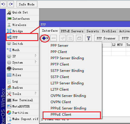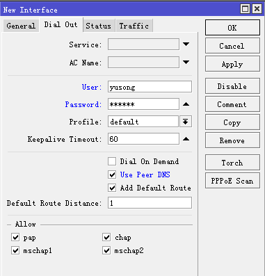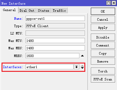 PPPoE-client创建后取名pppoe-out1,选择拨号的interface为ether1