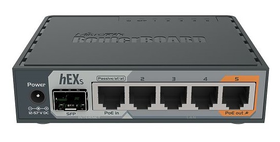 hEX-S的CPU和内存与RB750Gr3保持不变,在原有的5个千兆以太网接口上,增加了一个SFP接口,在最后一个以太网接口支持PoE输出功能,仍然有一个USB2.0接口和microSD槽,价格为69USD,比RB750Gr3贵差不多9USD。
