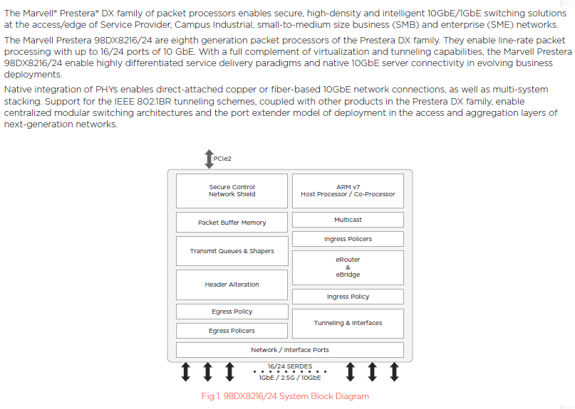 现在我们扒一扒到底这款16口万兆交换机是什么样,除了RouterOS系统外,先看这款产品使用的是什么CPU,官方提供资料CPU采用Marvell的98DX8216B0-BRR4C000,查找了marvell的官方资料