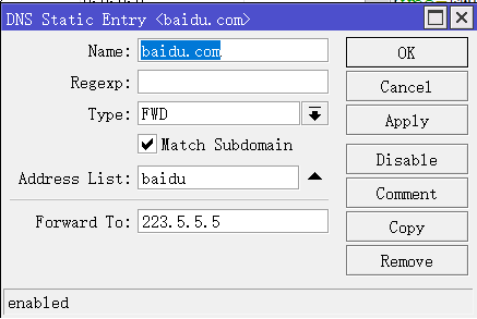 add address-list=baidu forward-to=223.5.5.5 match-subdomain=yes name=baidu.com type=FWD