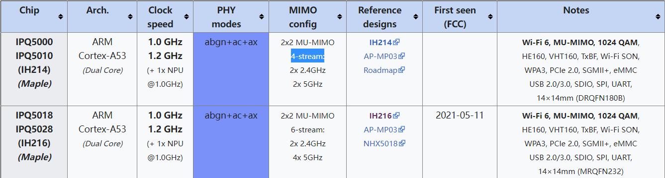 CPU采用的是IPQ-5018,其实和hAP ax Lite的IPQ-5010一样采用2核心A53处理器,只是WiFi空间流不同,从下面的对比可以看出在WiFi方面MikroTik是多么的吝啬,估计RouterOS也没有去适配NPU。