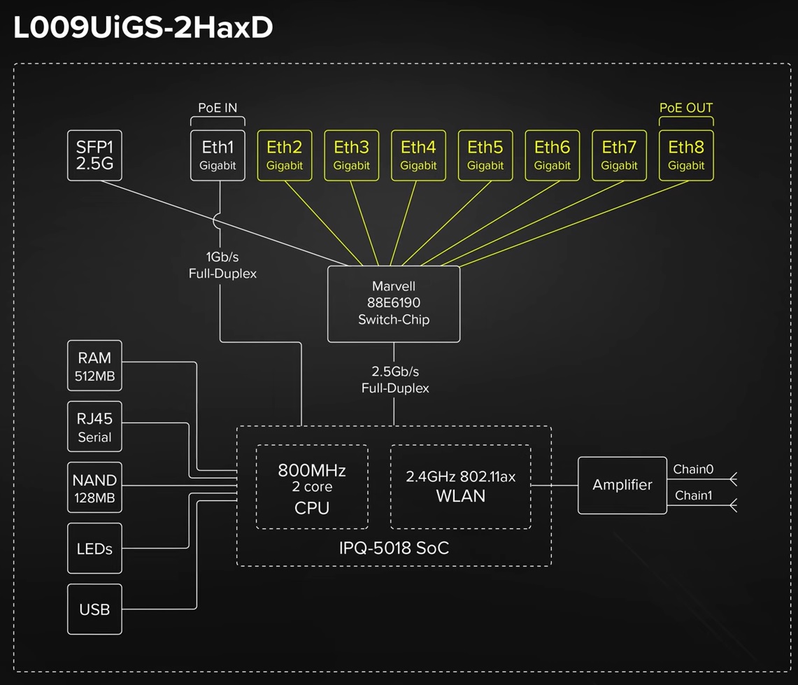 L009采用了Marvell 88E6190交换芯片,它提供了一个2.5Gbps全双工总线到CPU(除了Ether1)。第一个端口有自己的1Gbps全双工总线到CPU。在L009UiGS-2HaxD-IN无线版本,采用WiFi6标准的2.4GHz 2x2无线。独立的交换芯片意味着L009将支持完整的L2 HW-offloading硬件加速。需要注意ether1端口将独立在交换芯片之前,可以理解为默认作为WAN口使用。